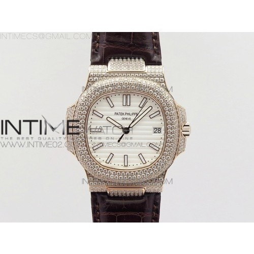 파텍필립 노틸러스 점보 5711 풀다이아몬드 로즈골드 화이트다이얼 악어가죽스트랩 NAUTILUS JUMBO 5711 RG FULL PAVED DIAMONDS WHITE DIAL CASE ON BROWN CROCO LEATHER STRAP A324
